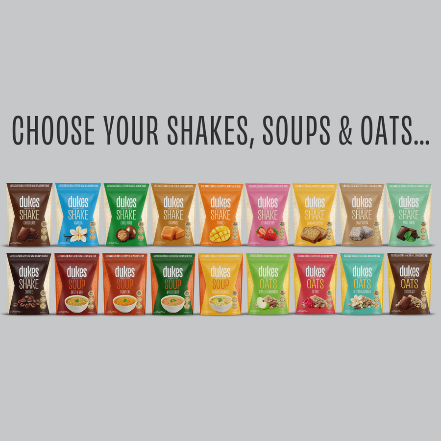 Dukes® huge range of flavours includes 13 diet shakes, 4 diet soups & 4 diet oats that are delicious, filling & work.