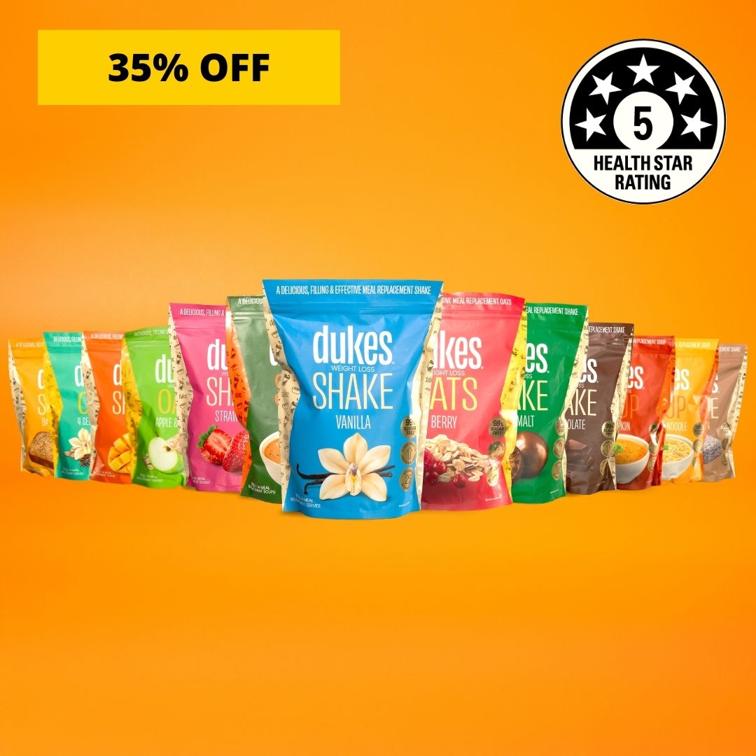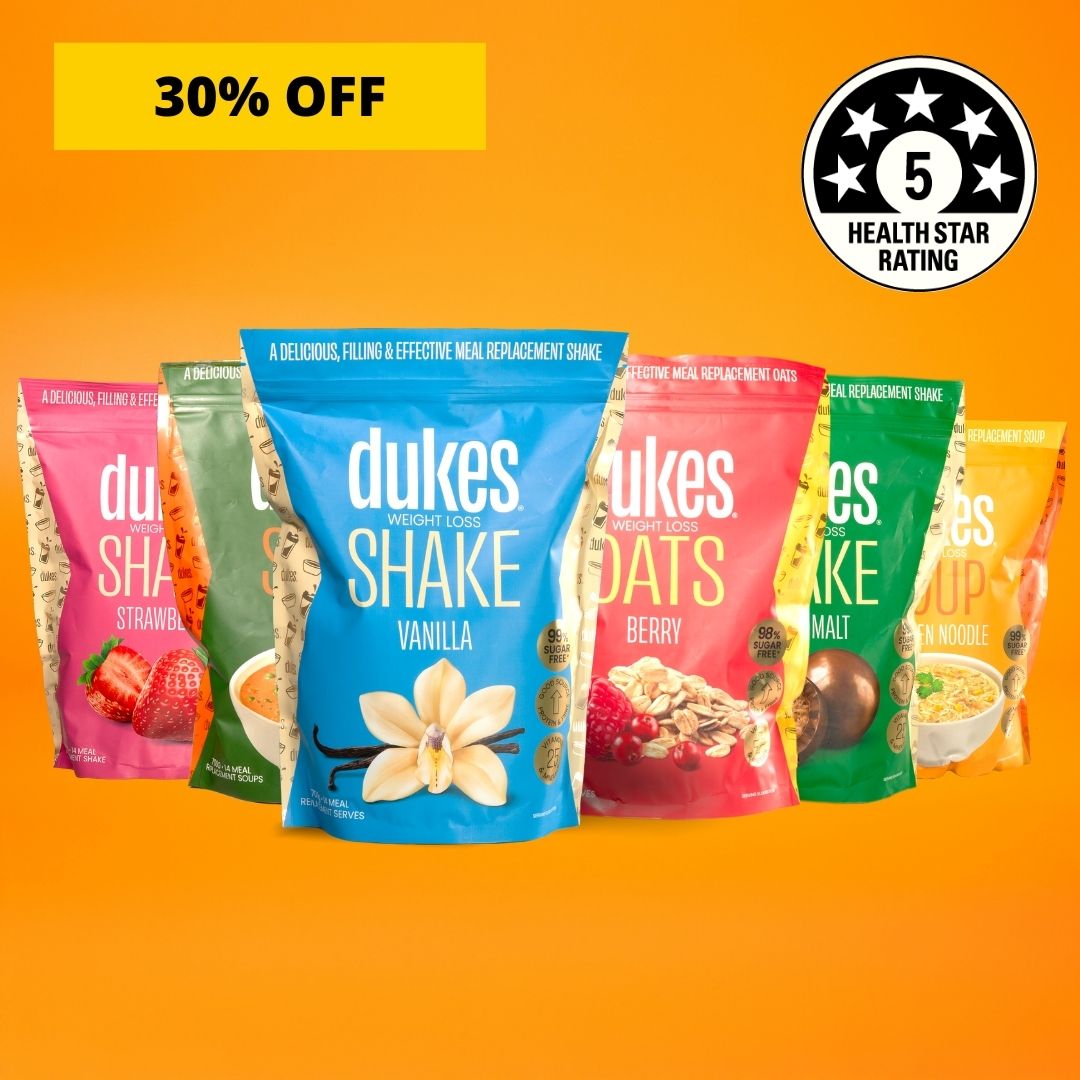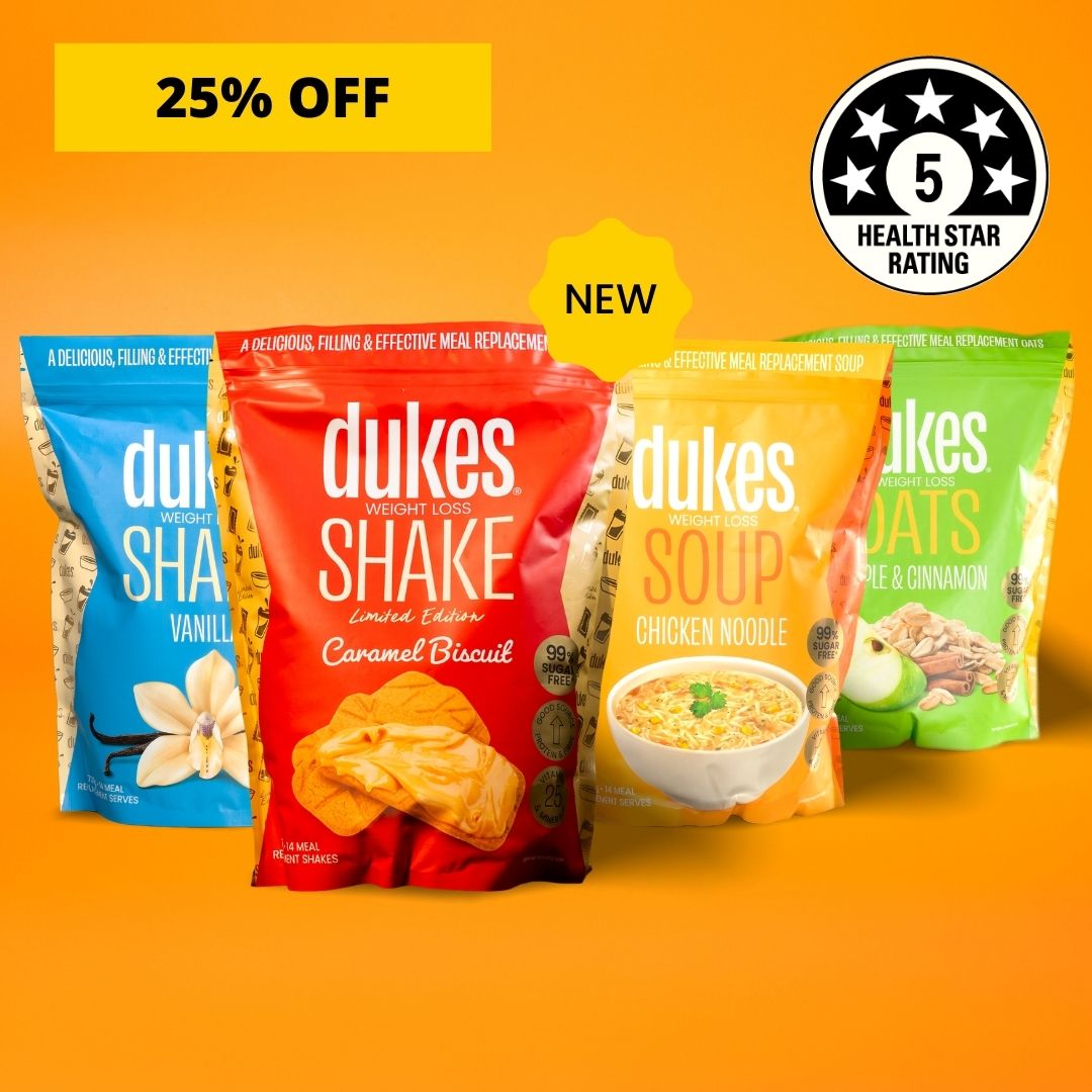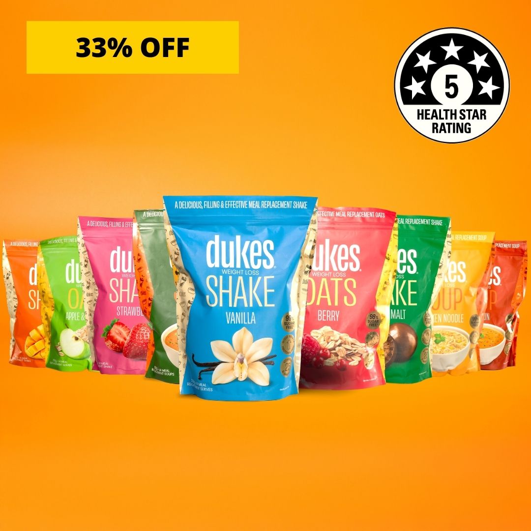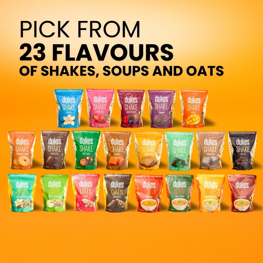 Buy 3 get 1 free, save an amazing $54.95 (25% off). Contains 56 filling Dukes meal replacement shakes, soups or oats, just select any 4 bags from our massive range of 20 flavours.